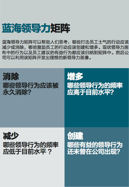 领导力画布给人们带来一个可信的框架,它直观地指出领导者需要的改进。与传统自上而下的领导力项目相比,蓝海领导力更注重程序的公平性,这让监管和执行的难度大大降低。此外,管理者不再需要改变本性或打破旧习,只需改变自己的行动,这让他们可以在短时间内完成领导力转型。蓝海领导力的另一项优势是可扩展性,你不必等待公司的最高管理者率先采取行动。无论级别高低,你都可以通过上述4步来唤醒员工的潜力和激情。