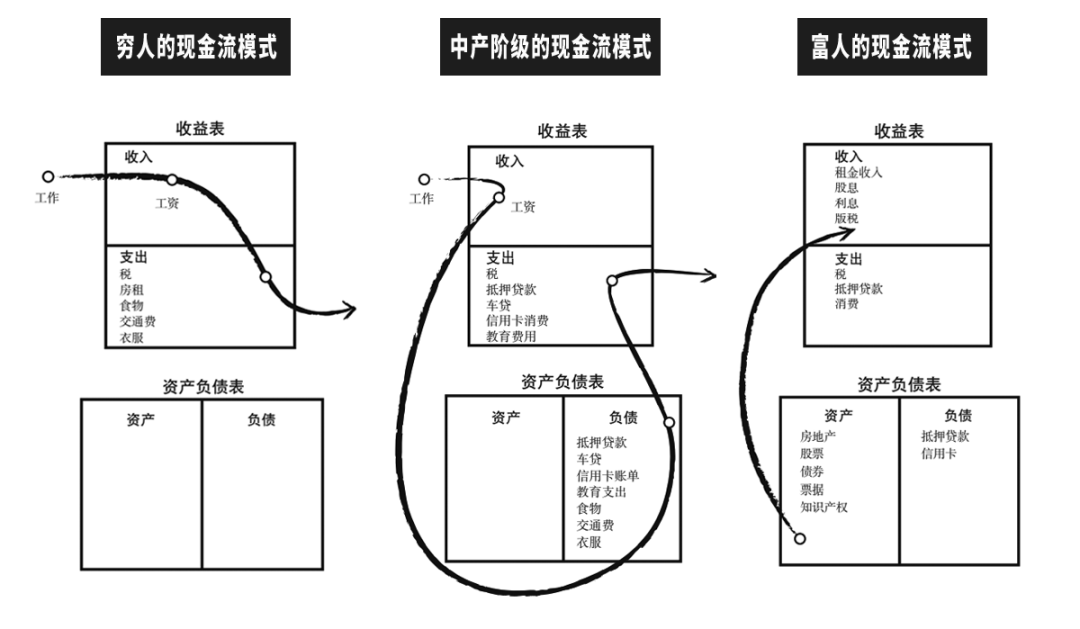 下面是穷人、中产阶级和富人的现金流模式图,它分别表现了三类人是怎么处理他们的钱的。