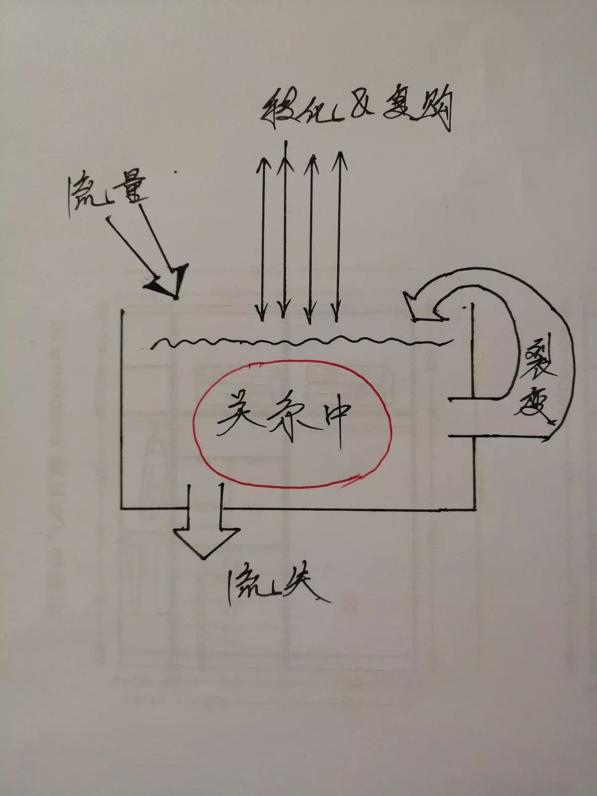 传统商业(尤其是电子商务)往往采用流量模型1.0,大概长成漏斗的样子,从外面搞进来用户流量,一层一层转化留存(字很丑,见谅哈):