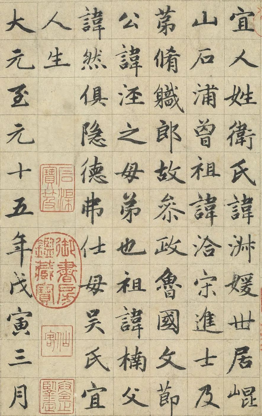 他传世作品很多,要问哪一件写得最虔诚、最一丝不苟,当属《卫宜人墓志》了。此作现藏于台北故宫博物院,是该馆的“一级甲等文物”,极少公开展出。《卫宜人墓志》写于至元十五年(1278年),也被称作《卫淑媛墓志》,全卷纵27.93厘米、横746.83厘米,共42行、400余字,单字大小约2.5厘米。