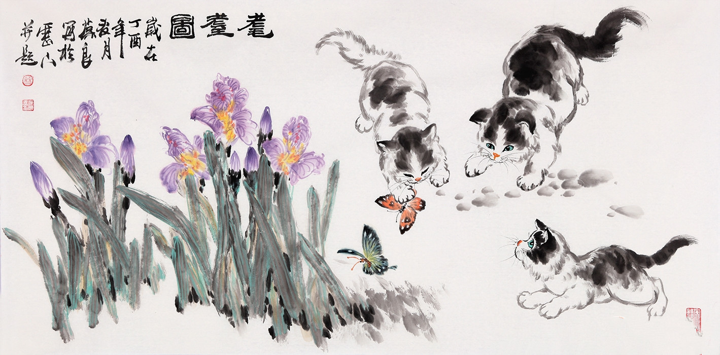 晋葆良老师画的猫好就好在神,画的老猫慈祥沉稳,能够将猫的不同阶段,表现的淋漓尽致。画中三只猫与蝴蝶嬉戏,画面和谐唯美,一旁的画更是起到了画龙点睛的作用。猫同“耄”,蝶同“耋”,在中国画中,猫碟图是一个固定的主题,寓意着以谐音取“耄耋”之寿的美好含义。中国人崇尚长寿,又有着尊重老人的优良传统,因此在中国画中有很大一部分的耄耋图是为祝寿而作,也可以挂在卧室,寓意健康长寿。