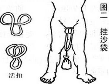 10.挂沙袋:将边长为0.5米的正方形纱布折叠成纱布袋后,两头缝合,并另做一活扣备用。站立式,两足距离应比肩宽,将活扣套在阴囊及阴茎根部(扣扎松紧适度,阴毛在外),下挂3—4千克重的沙袋(沙袋离地),练功者两手叉腰,臀部前后摆动,带动沙袋摆动60—100次。以阴茎、睾丸充血、微微酸胀而不痛为佳(图二)。
